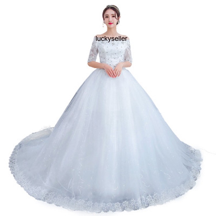 Gaun pengantin dress elegan model off shoulder bahan renda untuk pesta. Kami importir dan distributor gaun pengantin, kami juga menjual gaun pengantin dengan harga murah harga pabrik. Kelebihan dari gaun jenis ini adalah mampu menunjang penampilan untuk anda yang memiliki ukuran tubuh yang tidak terlalu tinggi. Kebanyakan gaun pengantin dibuat dalam warna off white, maka sepatunya juga harus disesuaikan warnanya. Selain itu, kerah v juga akan membuat leher kamu terkesan lebih tinggi.